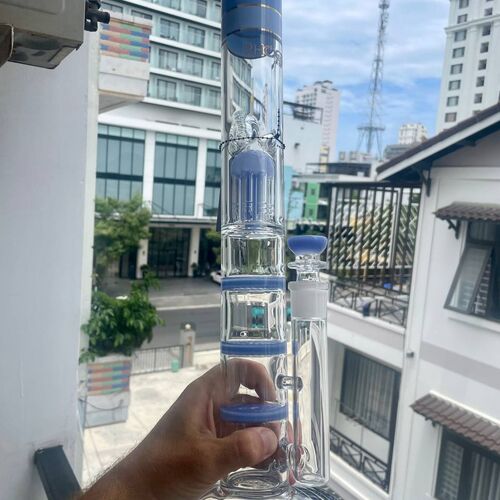 ➤ Featuring elegant blue accents on the stable circular base, the intricate percolator rings, and the comfortable mouthpiece, this bong combines high functionality with a striking aesthetic appeal.